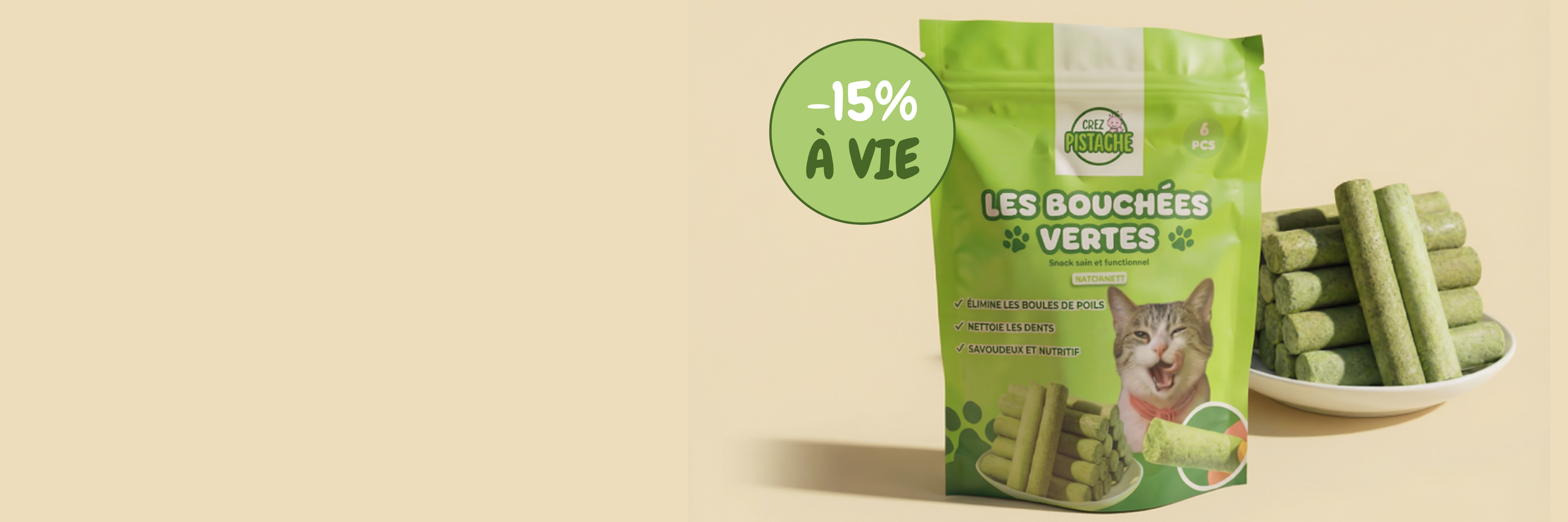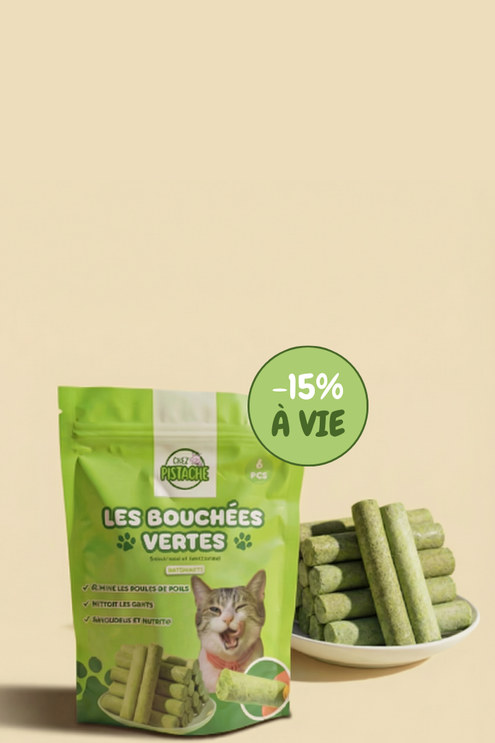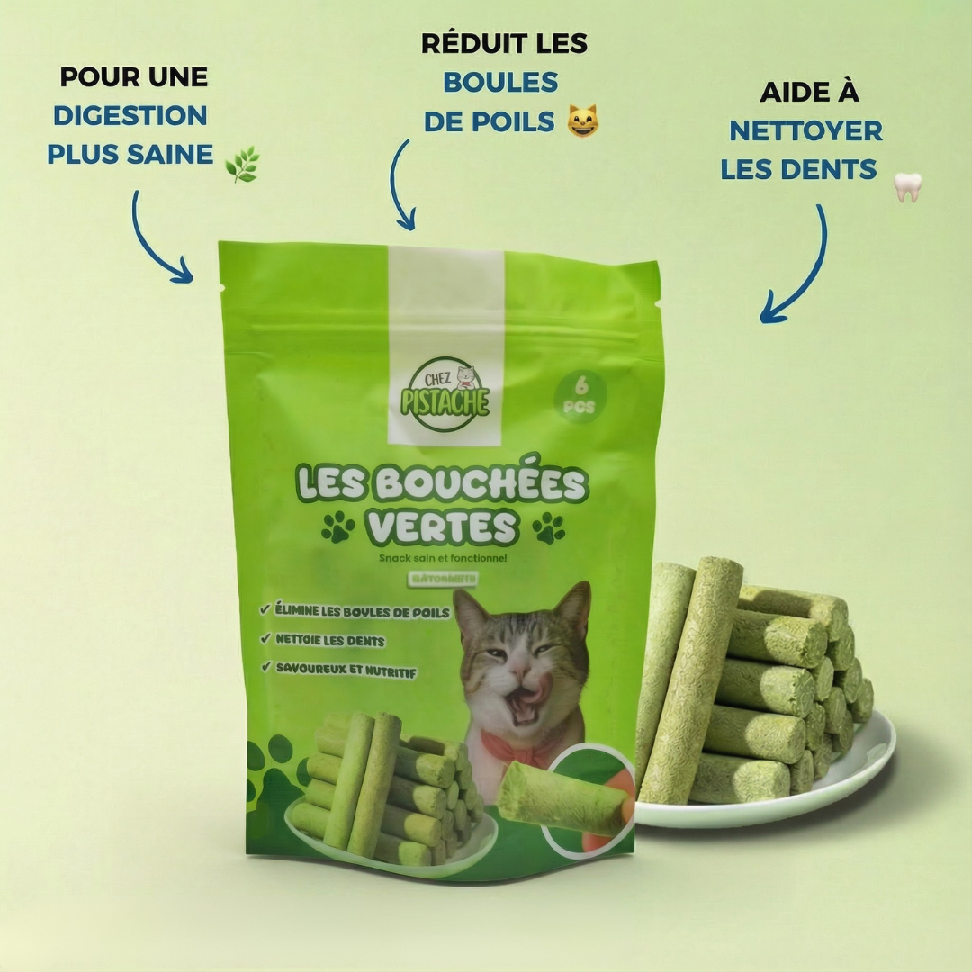Un snack fonctionnel et gourmand qui favorise la digestion, réduit les boules de poils et contribue à une meilleure hygiène bucco-dentaire.